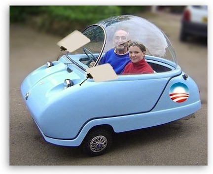 Back in the United States, President Obama hadn't wasted any time making use of his new dictatorial powers. He immediately nationalized Ford, the only remaining US auto manufacturer that hadn't been already taken over by the Obama administration and the only one that had never accepted any money from the federal government. It was a hostile takeover, to be sure, and received a lot of negative press as a result. That is, until everyone involved in reporting the story in a negative way was arrested. After that there were no more negative news stories about it. President Obama then ordered the newly nationalized Ford to be merged with the already nationalized GM and Chrysler. He renamed the combined auto giant The Obama Group Ltd. The company vehicles would wear a badge reading simply "OG." He then ordered that no more SUVs, trucks or other gasoline-powered vehicles could be built at The Obama Group. From now on, all vehicles produced were to be hybrids, purely electric, or some variation of hybrid electric and or diesel. Also, all cars were to be small, no bigger than a 'smart car', and all must be painted green, symbolizing their supposedly environmentally friendly focus. The President predicted in his now nightly speech to the nation as he announced his actions that his new "Obamacars" would outsell all the previous models of made-in-America cars because, he said, "this is what the American People have been waiting for." He then decreed that no manufacturer would be permitted to sell anything else in the U.S. without a special permit from the EPA.